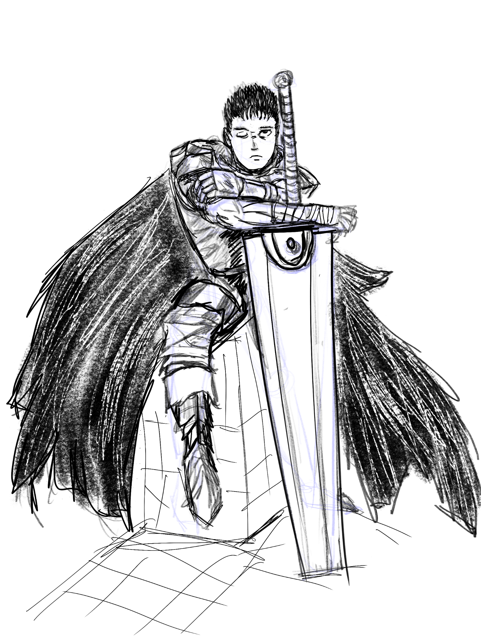I will have to do some more sketches and maybe some shadow blocking to get the form of Guts just right and then blow it up on my iPad and refine it that way. I want to it to be a faithful homage to Kentaro Miura's style and character.