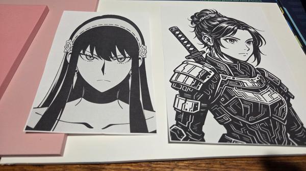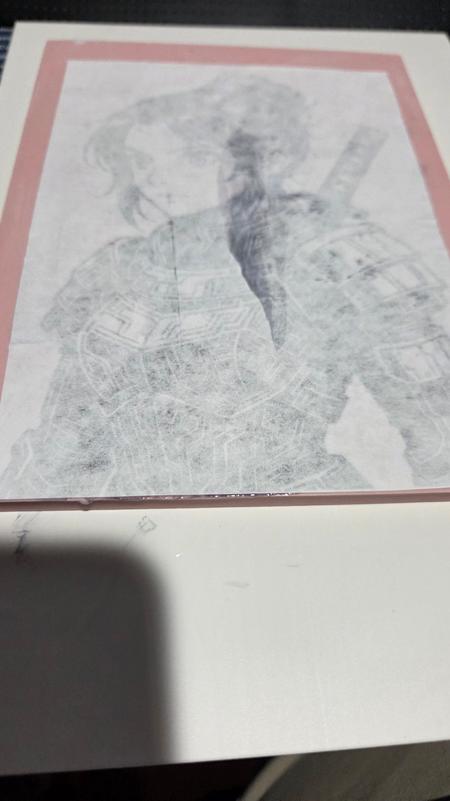 Today I received my Gel Acrylic Medium (Matte) for doing the transfer. I couldn't stop at one image, and chose two images. One of Yor Forger from Spy x Family and a generic samurai character. Instructions I found were to coat the linocut blocks in the acrylic medium and then place the printed images on each piece. Then I went and smoothed out the prints so they bond well with the acrylic medium.