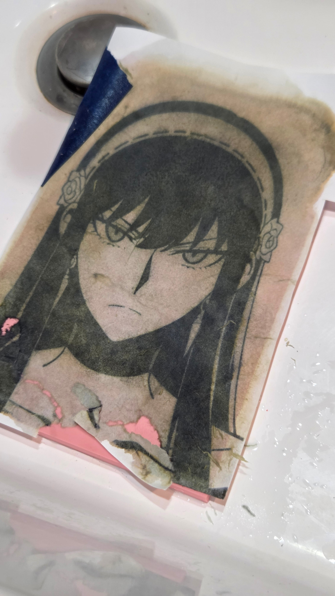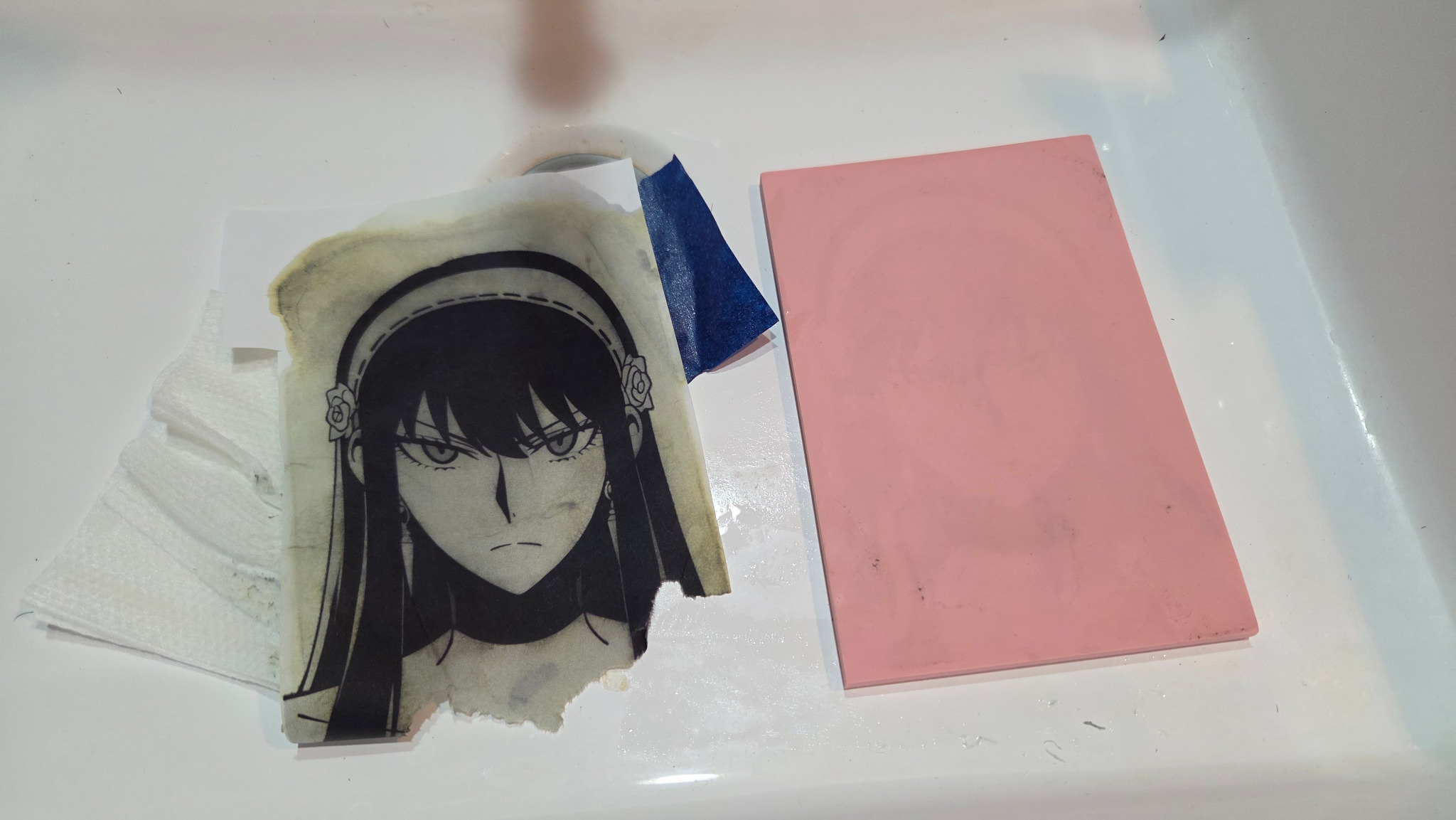 For today's adventure, I attempted to do a linocut transfer of an image of Yor Forger from Spy x Family. I cut the image and taped a corner of it to the rubber block I got in my printing kit for christmas.