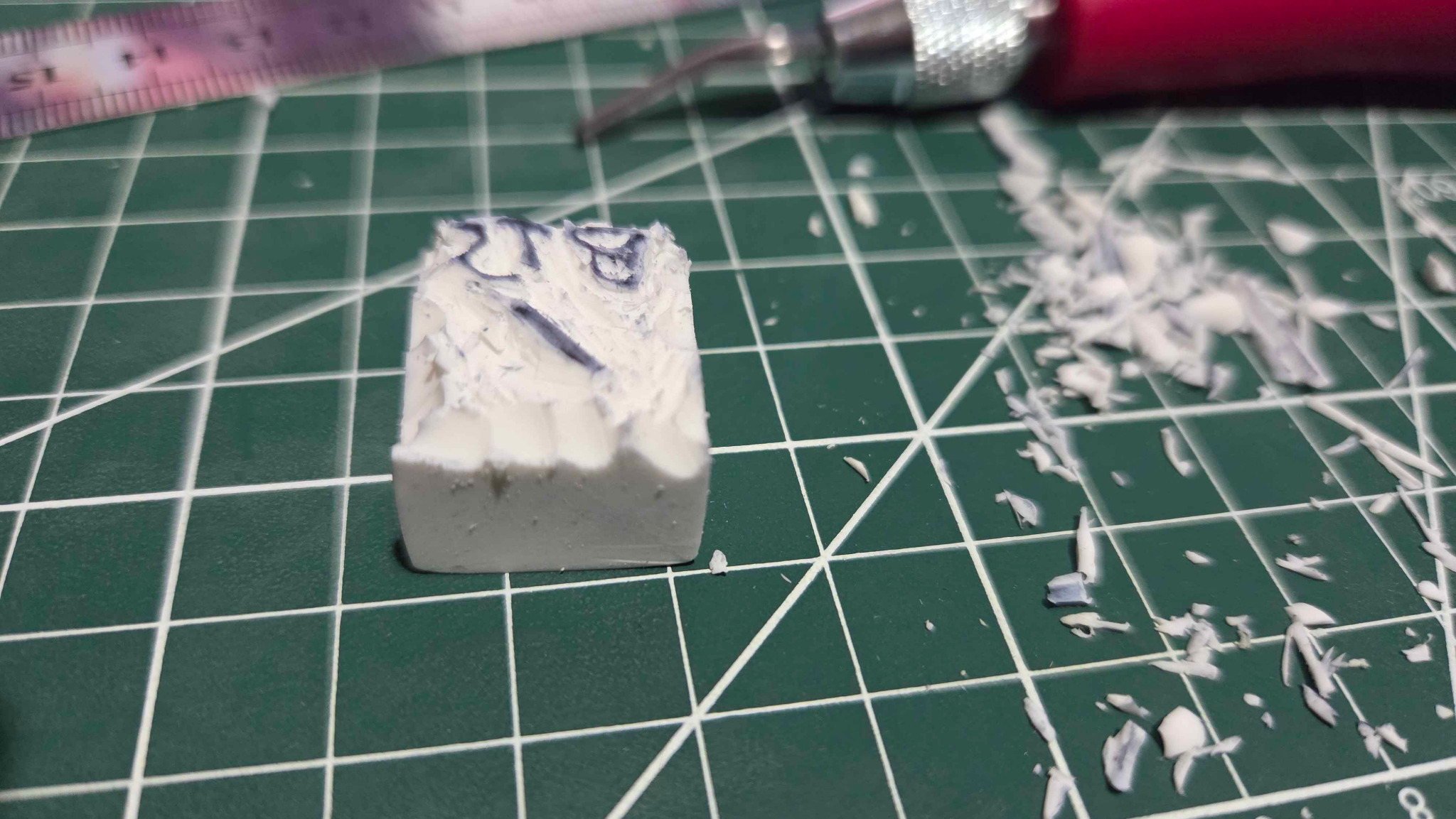 I then used the X-Acto knife and did a shallow cut to outline the letters on the stamp. I followed that up with the V-Groove carving tip and removed some of the eraser material surrounding the letters. My last step was to do some test stamps with it on some scrap paper. I think the results turned out pretty well for my first time completing the project. This will be the stamp I use for 2026 for all my linocut prints that I prepare.