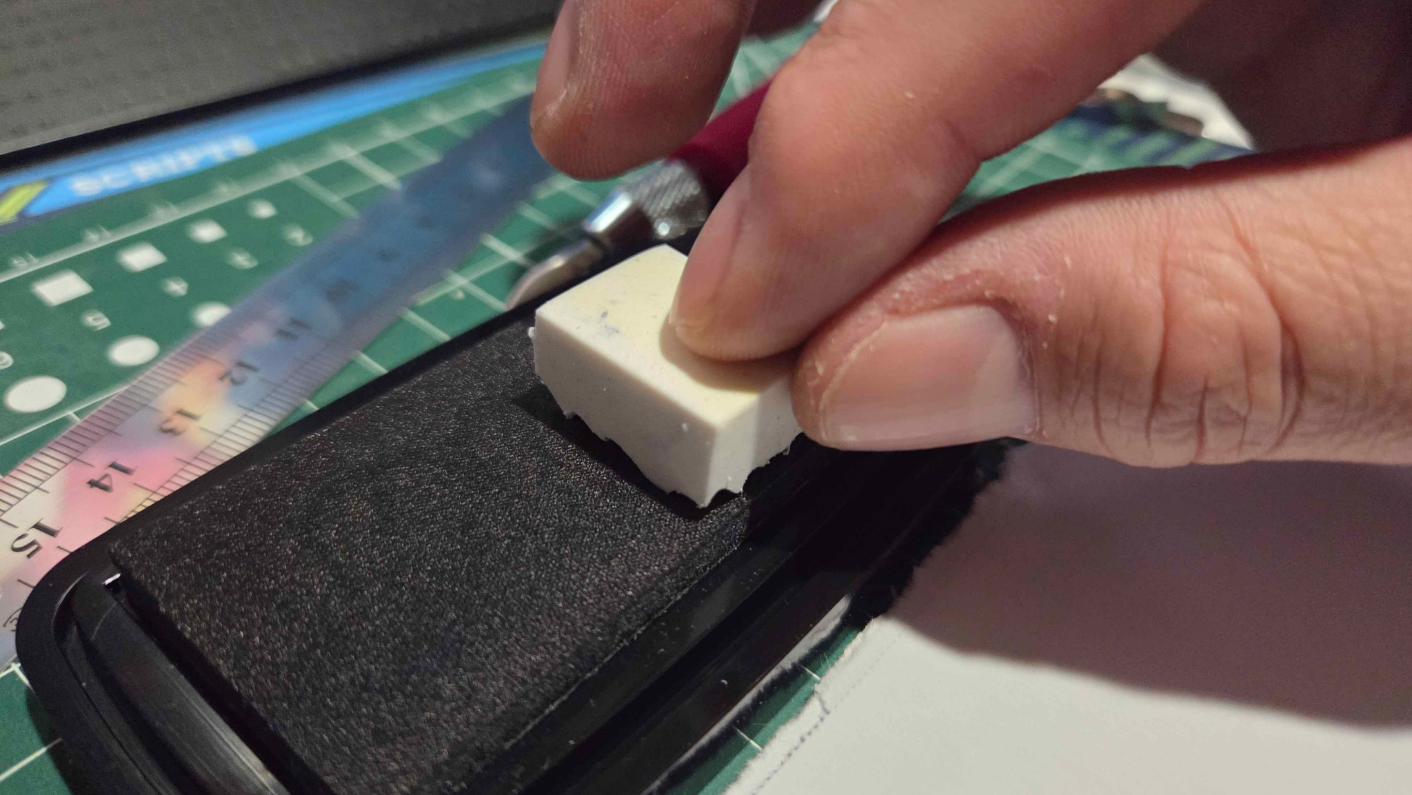 For the stamp, I used the following: an Android app called AR Drawing, a polymer eraser, a fine point black sharpie pen, an X-Acto knife, and a linoleum carving tool. I did a sketch of my signature that I wanted and took a picture of it. Then I loaded it into the AR Drawing App after I reversed the image so it would be backwards on the stamp. The AR Drawing App is neat in that it overlays on top of the surface and you can trace it with a sharpie.
