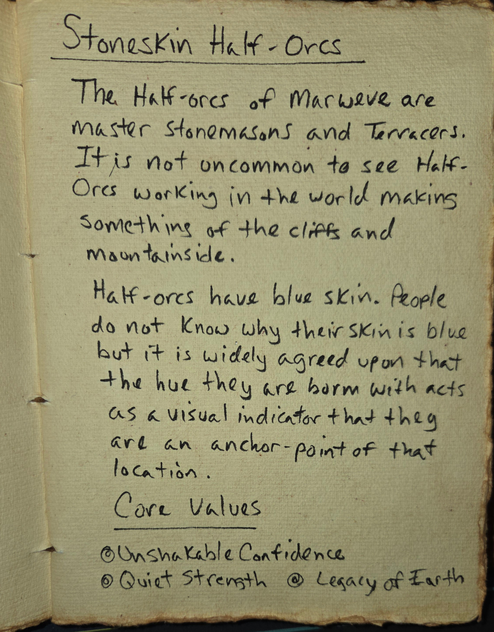 This entry is from my world-building journal for a world called Marweve. If you recall from my other post regarding the Hearth Dwarves, the traditional roles of the races are different. The blue skinned half-orcs of Marweve do more with earth shaping and stonework than any dwarf does. I still need to work on the sketch of the half-orc for the journal.