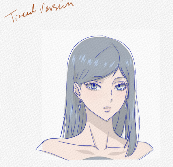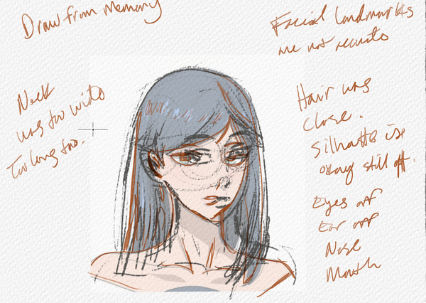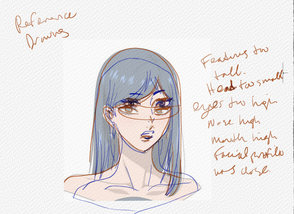 Hello! Here we are on day two of the TRBC process for learning anime/manga style. If you don't recall, TRBC is Trace, Reference, Blind, Correct. I found an image on Pinterest for today and did a screenshot of a character and imported it into Rebelle Pro 8. As you can see below, the traced version is pretty much spot on 1:1 of the original portrait. The Reference version had some issues and I did what I could for taking notes on it. The Blind draw had a few things correct from my sketch and then harder lines over that. Still, there was a lot to be desired.