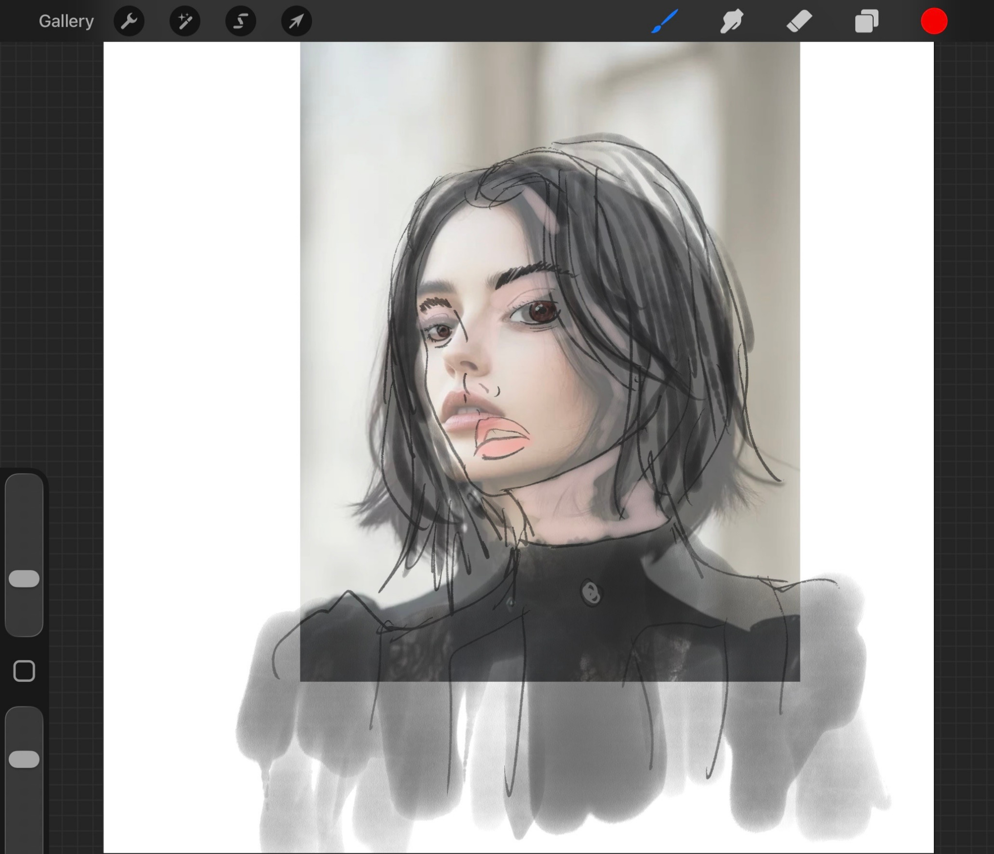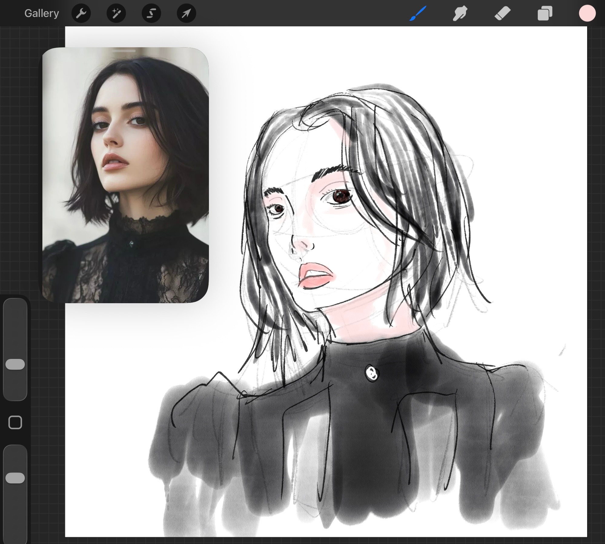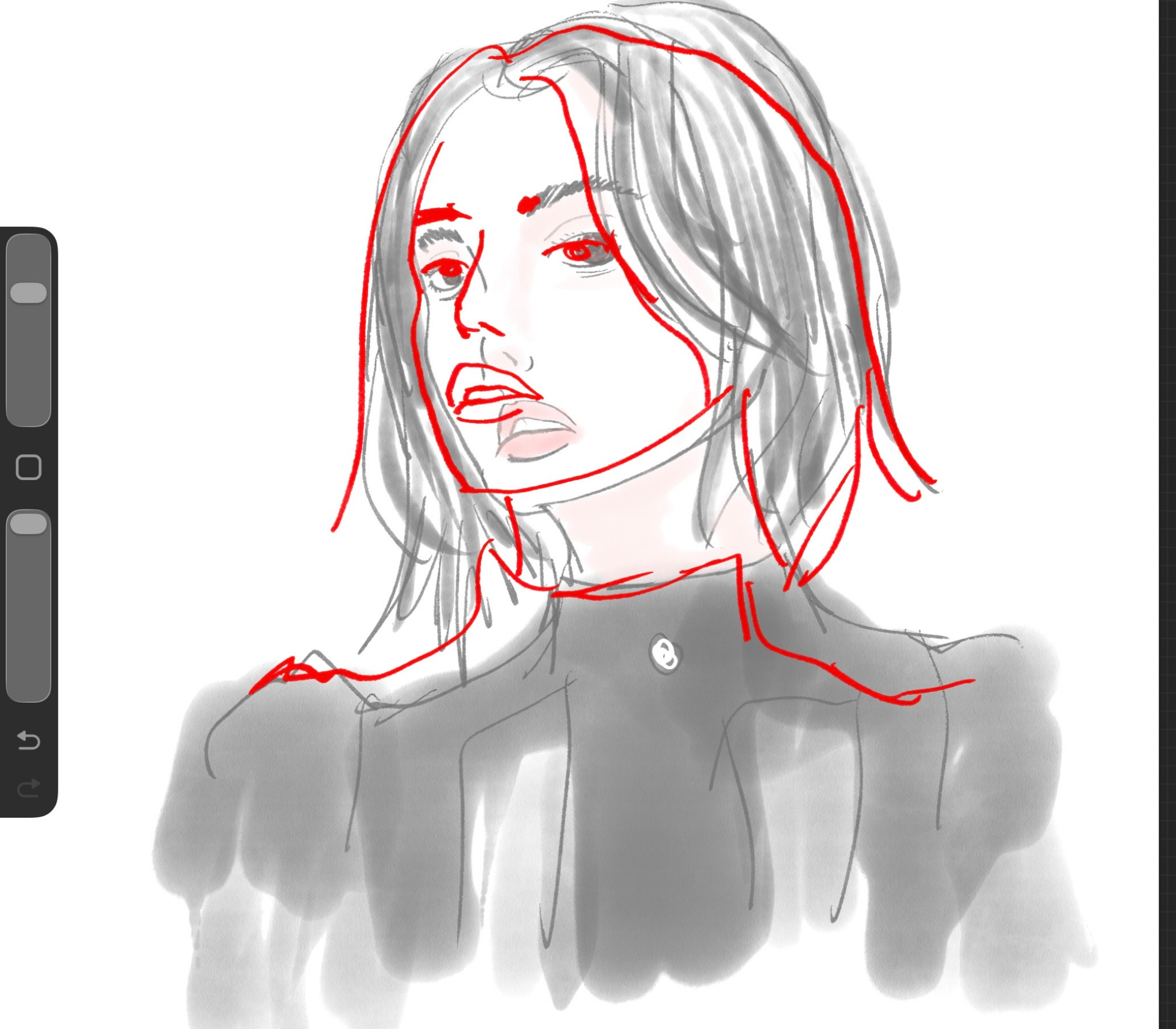 The last two images here show the areas where I missed the mark on my lines. I did get an eyebrow correct mostly! That's a win. In fact, the eye placement was pretty much spot on, but everything else like the mouth and nose and face line were off, which resulted in everything else being off, like the hair and neck and dress.