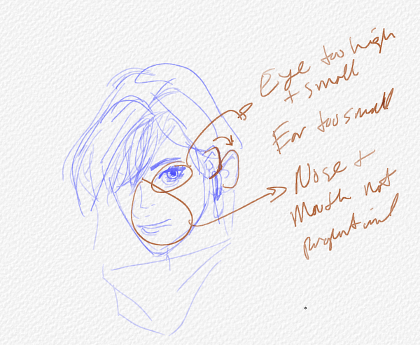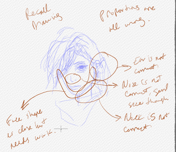Correct- I adjusted my Trace, Reference and Blind drawings to be the same size to see how close I was in the reference and blind drawings. At this point, it was important to use red ink and circle the areas that had issues and make notes on what needed to be corrected. Each drawing had faults at different areas and it showed how much work I really need to do in order to get to where I want to. The red ink provides the immediate feedback and I can then make a new attempt the next day.