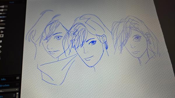 Trace- You find a piece of art that you want to emulate/replicate and capture. In day one, I chose an image of DC Comics' Supergirl on Pinterest. It had a anime/manga style that I am wanting to attain. I placed the image within Rebelle Pro 8 as its own layer and turned down the opacity to 30 percent. I used blue ink to draw over the lines, working on the facial features.